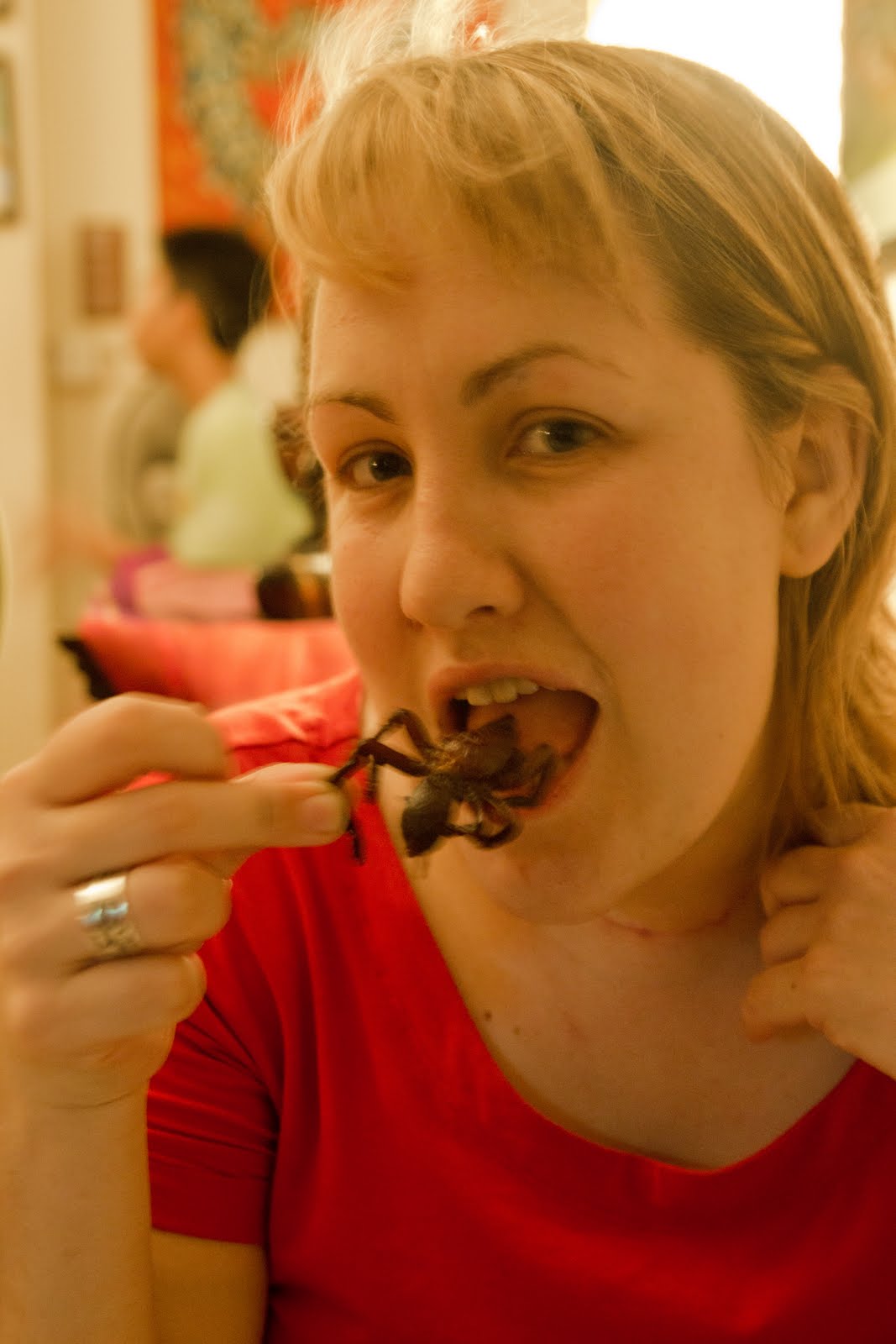 Bravely we ripped off a leg, tentatively dipped it in the lime pepper sauce and had a nibble. Totally fine if you keep your eyes closed. Tasted like deep fried nothing, crisp, almost hollow airy tubes. So far bearable. Meanwhile, Jed had ventured to the body and encouraged me to give it a go to get my opinion. It took quite a few mouthfuls of fish amok to pluck up the courage. I bit into the bulbous sac and a squishy nutty texture oozed into my mouth. Nasty! Didn't warrant spitting out, but still, not exactly a desirable flavour/texture combo that I need again. We ate through the rest of our meal, feeling a little ill sharing our table with the remainder of the spider carcasses, but proud we had a story to tell and for our culinary bravery on our second day!